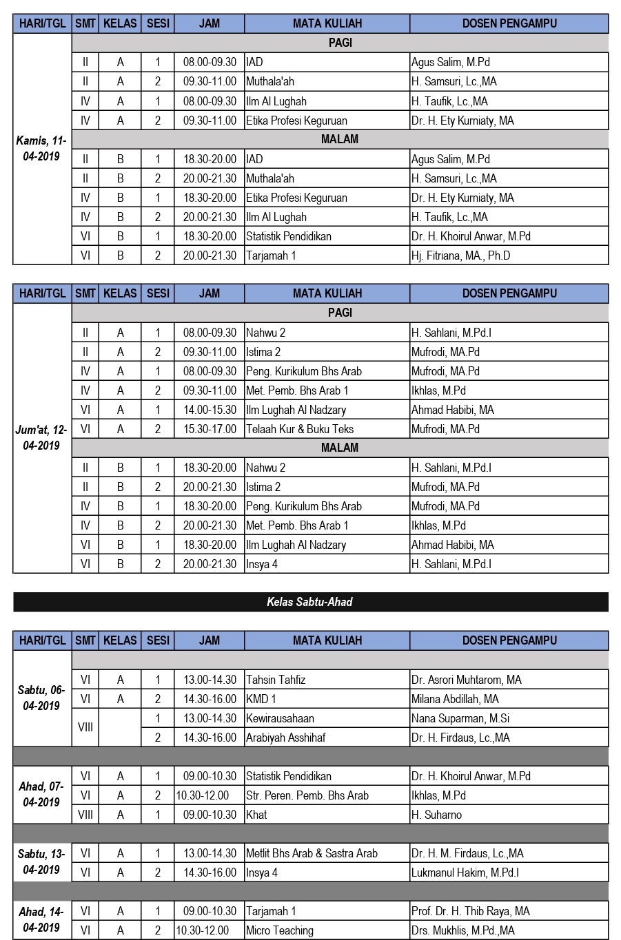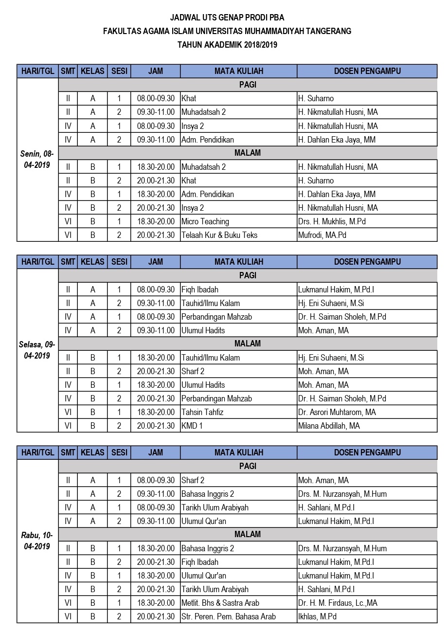 Home Berita Jadwal UTS PBA Semester Genap 2018/2019BeritaInformasiJadwal UTS PBA Semester Genap 2018/2019April 5, 201914650FacebookTwitterPinterestWhatsAppTelegram Berikut adalah Jadwal UTS Pendidikan Bahasa Arab (PBA) Semester Genap 2018/2019:
